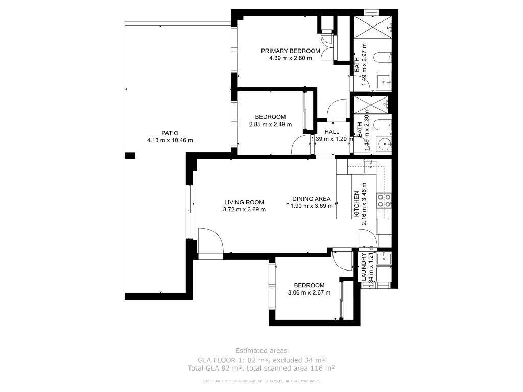 Ca 82 kvm brutto, inneholdende: Hall, Stue/spisestue, åpen kjøkkenløsning, 3 soverom, 2 bad, grovkjøkken/vaskerom. Utgang fra stue til stor ugenert terrasse på 43 m2.