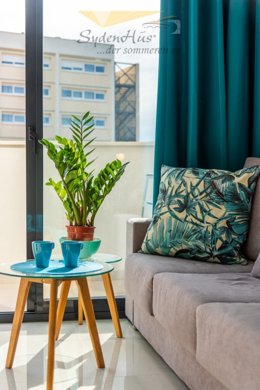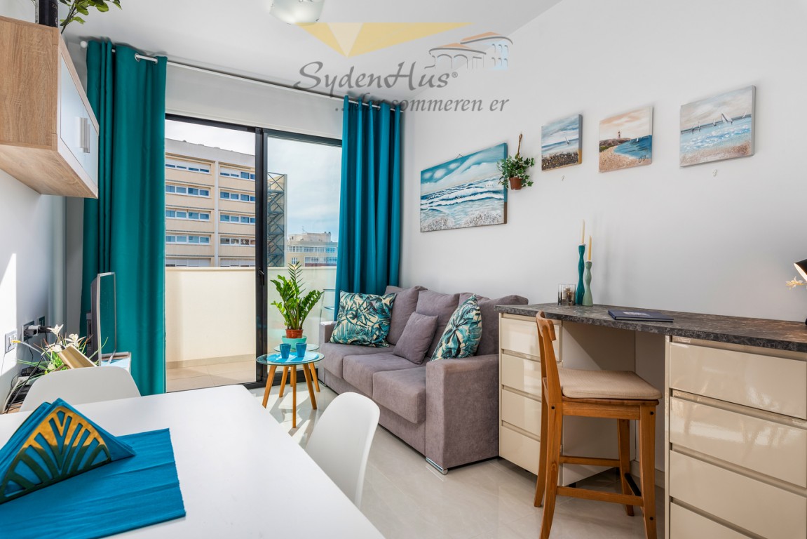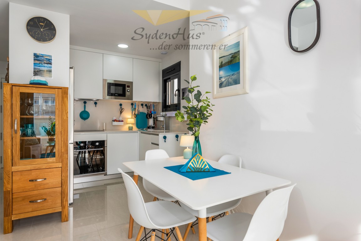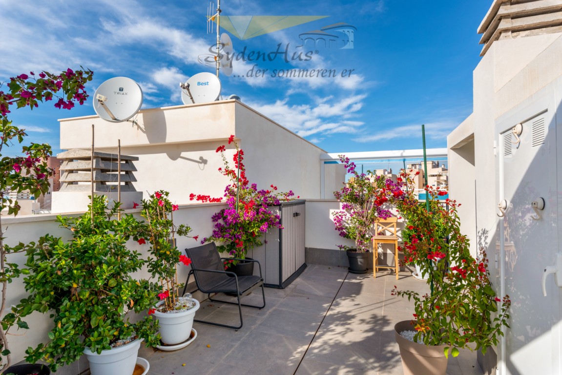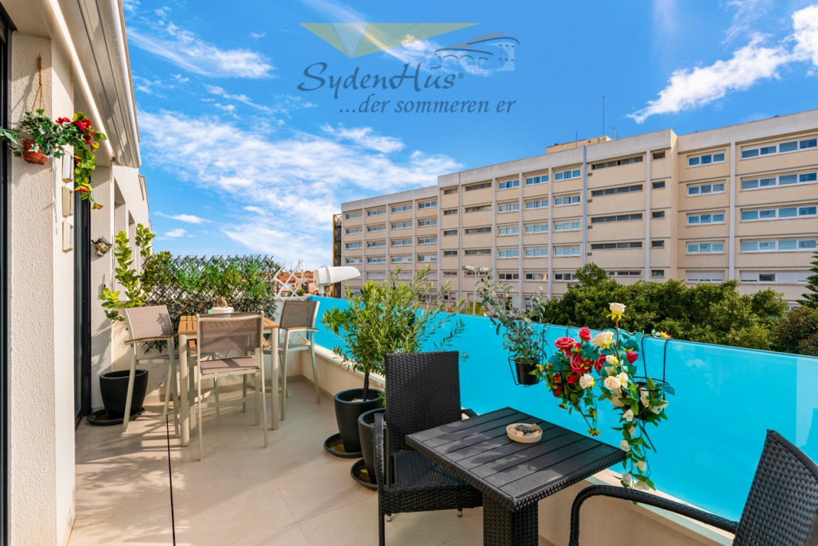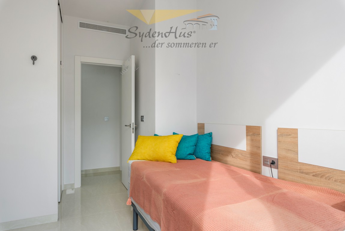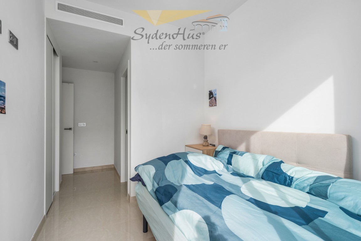 Boligen er endeseksjon i toppetasje (3. etasje norsk/2nd etg spansk) på nybygg oppført 2019, og inneholder:  gang, åpen kjøkkenløsning mot spisestue og stue, liten barløsning mot gang, 2 soverom, 2 bad.  Utgang v/heve-skyvedører fra stue og begge soverom til 15 kvm syd/vest vendt terrasse m/grill og utemøbler .  I tillegg avlåst takterrasse/solarium utstyrt m/utekjøkken, dusj, grill.  Boligen leveres fullt møblert.1 garasje i lukket anlekk. 1 bod tilknyttet garasjen.