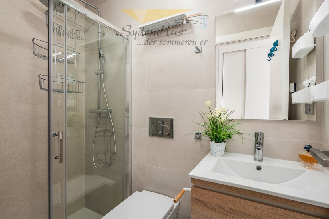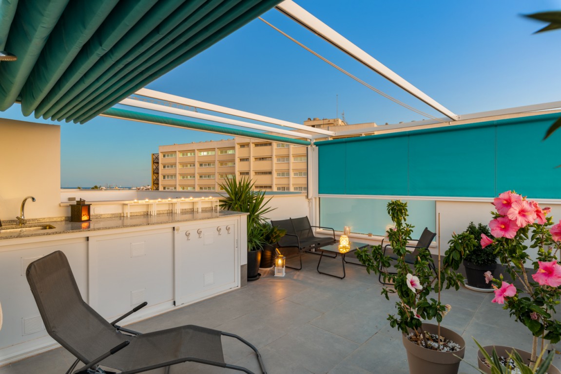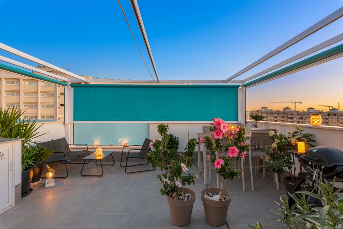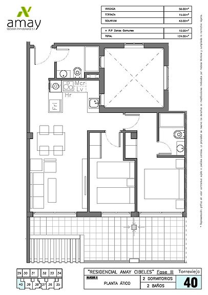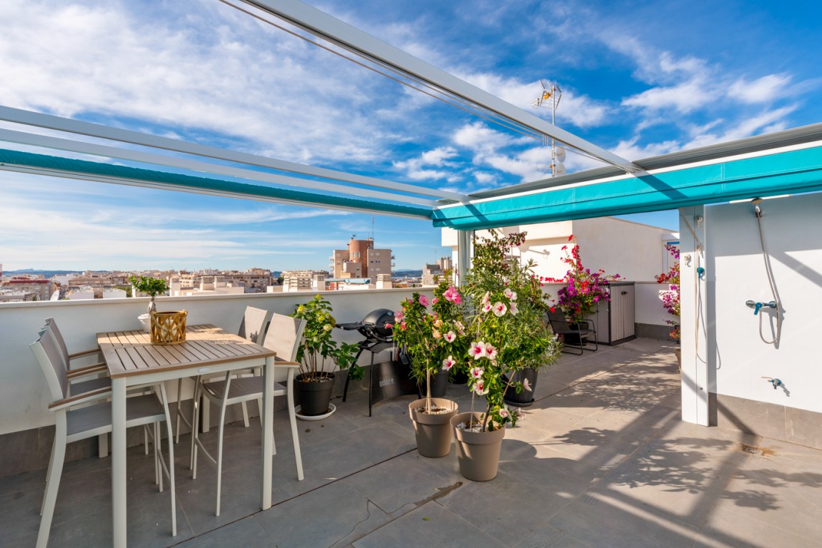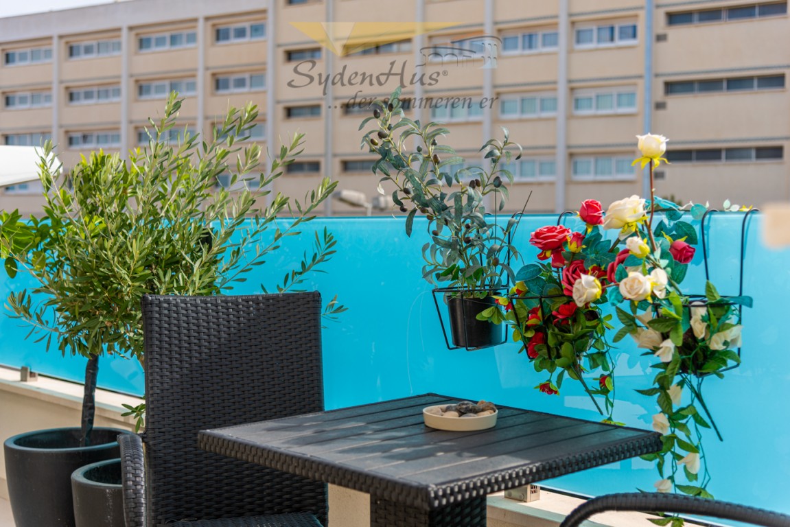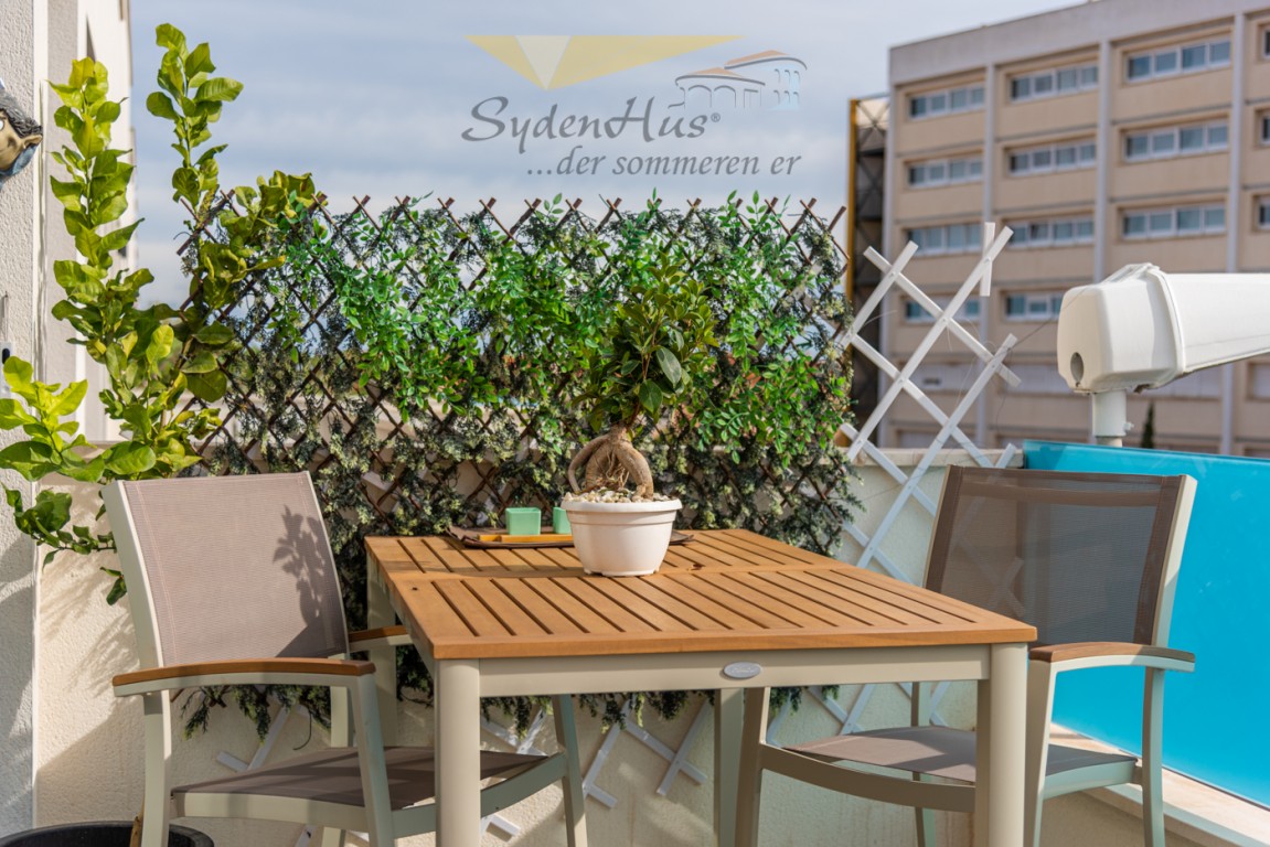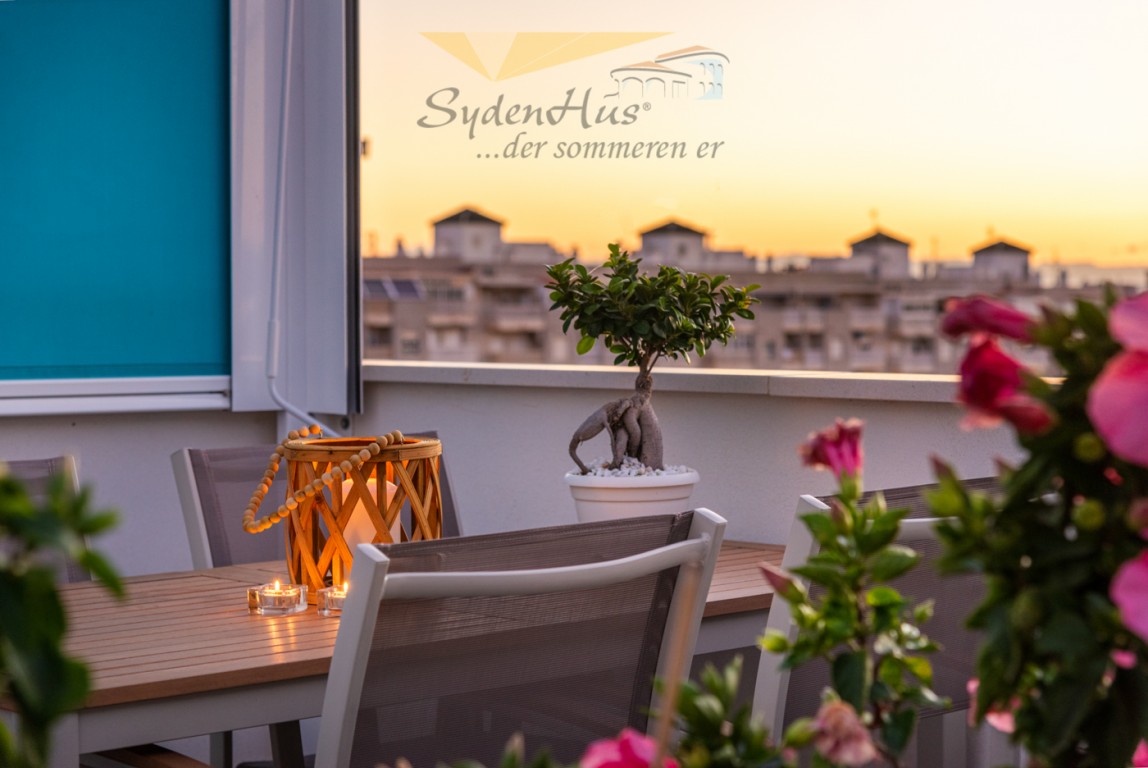 Boligen er endeseksjon i toppetasje (3. etasje norsk/2nd etg spansk) på nybygg oppført 2019, og inneholder:  gang, åpen kjøkkenløsning mot spisestue og stue, liten barløsning mot gang, 2 soverom, 2 bad.  Utgang v/heve-skyvedører fra stue og begge soverom til 15 kvm syd/vest vendt terrasse m/grill og utemøbler .  I tillegg avlåst takterrasse/solarium utstyrt m/utekjøkken, dusj, grill.  Boligen leveres fullt møblert.1 garasje i lukket anlekk. 1 bod tilknyttet garasjen.